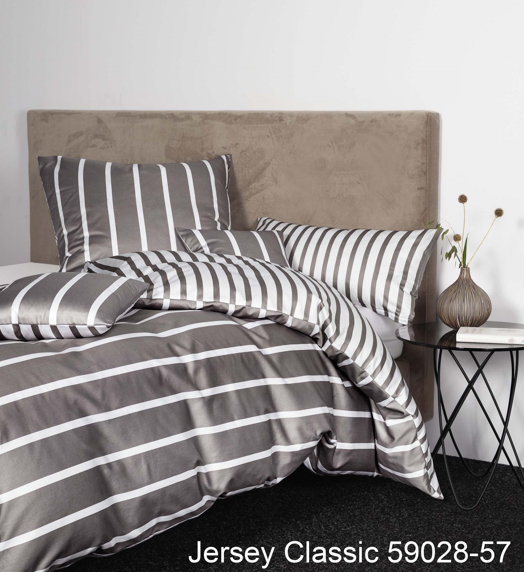 Mit der Janine Bettwäsche JERSEY CLASSIC 59028 kommen Liebhaber moderner Streifenprints voll auf ihre Kosten. Die Kissen- und Bettdeckenbezüge bringen Leichtigkeit in Ihr Schlafzimmer, während die geradlinige Musterung der Bettwäsche für Struktur sorgt. Mix and Match: Die Bettwäsche ist als Wendebettwäsche konfektioniert und damit stilvoll kombinierbar zu jeglichen Einrichtungsstilen.